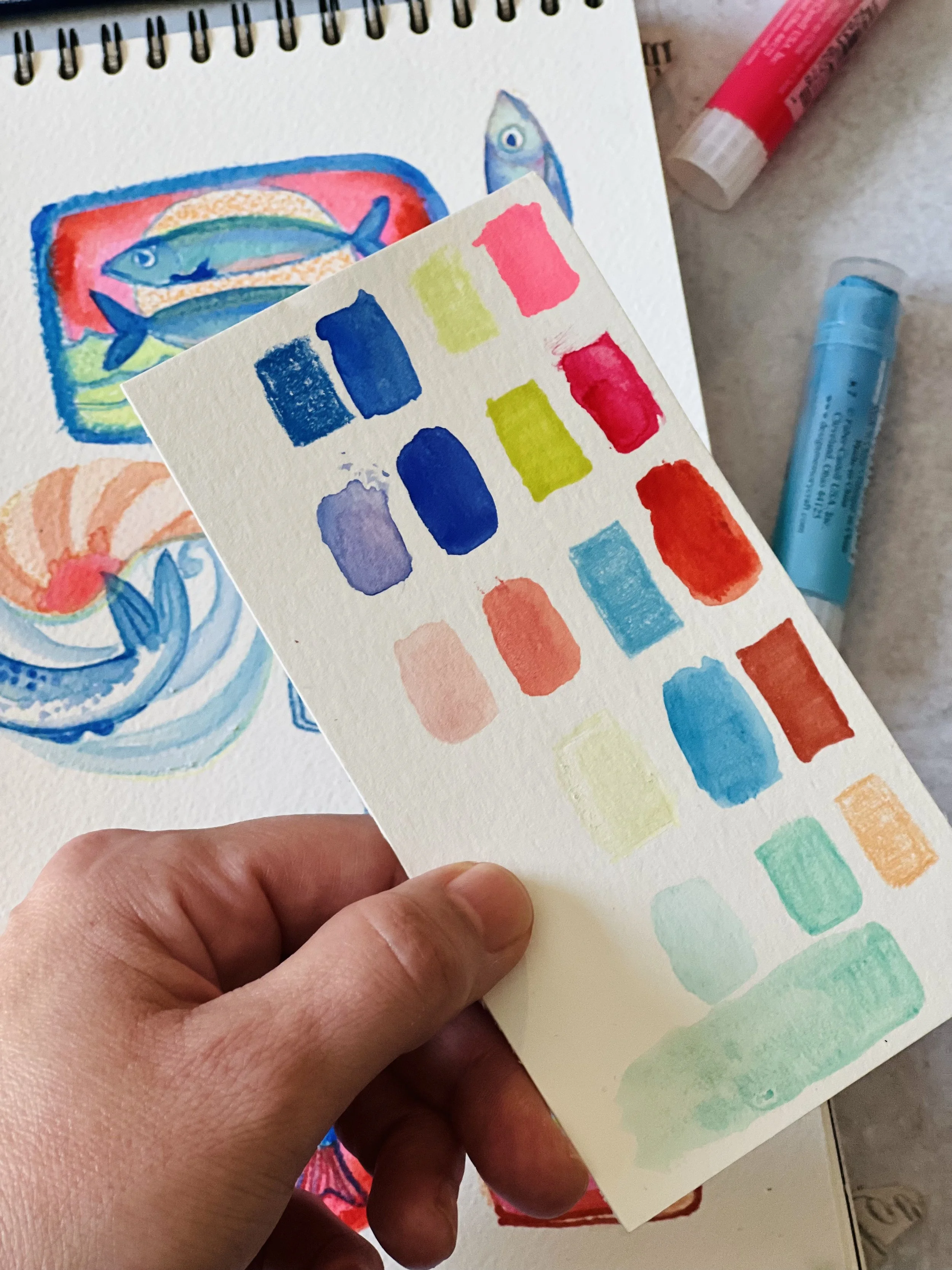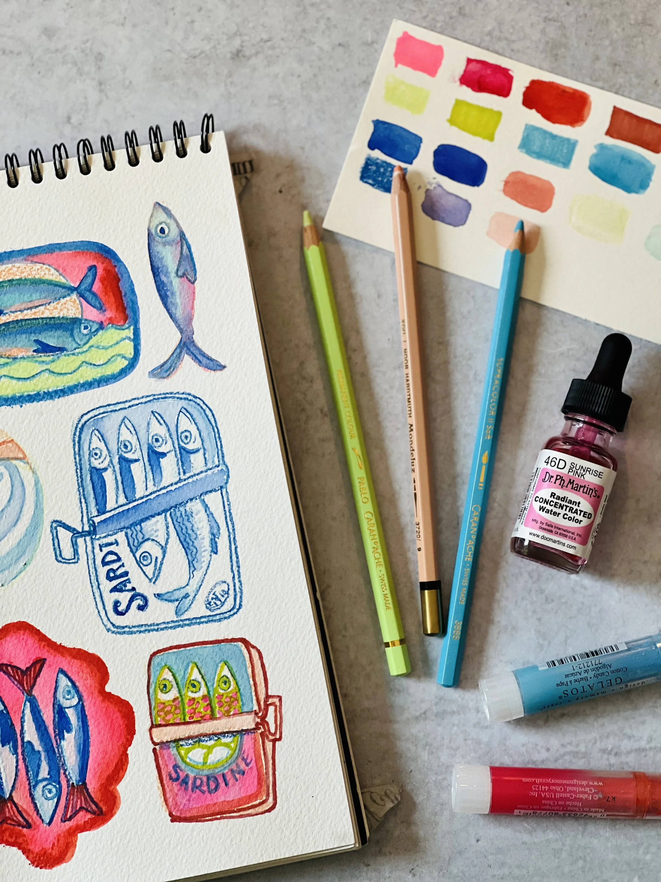 Summer color palette and sardine can sketches in a spiral-bound sketchbook, surrounded by Caran d’Ache pencils, gouache swatches, and Dr. Ph. Martin’s watercolor.