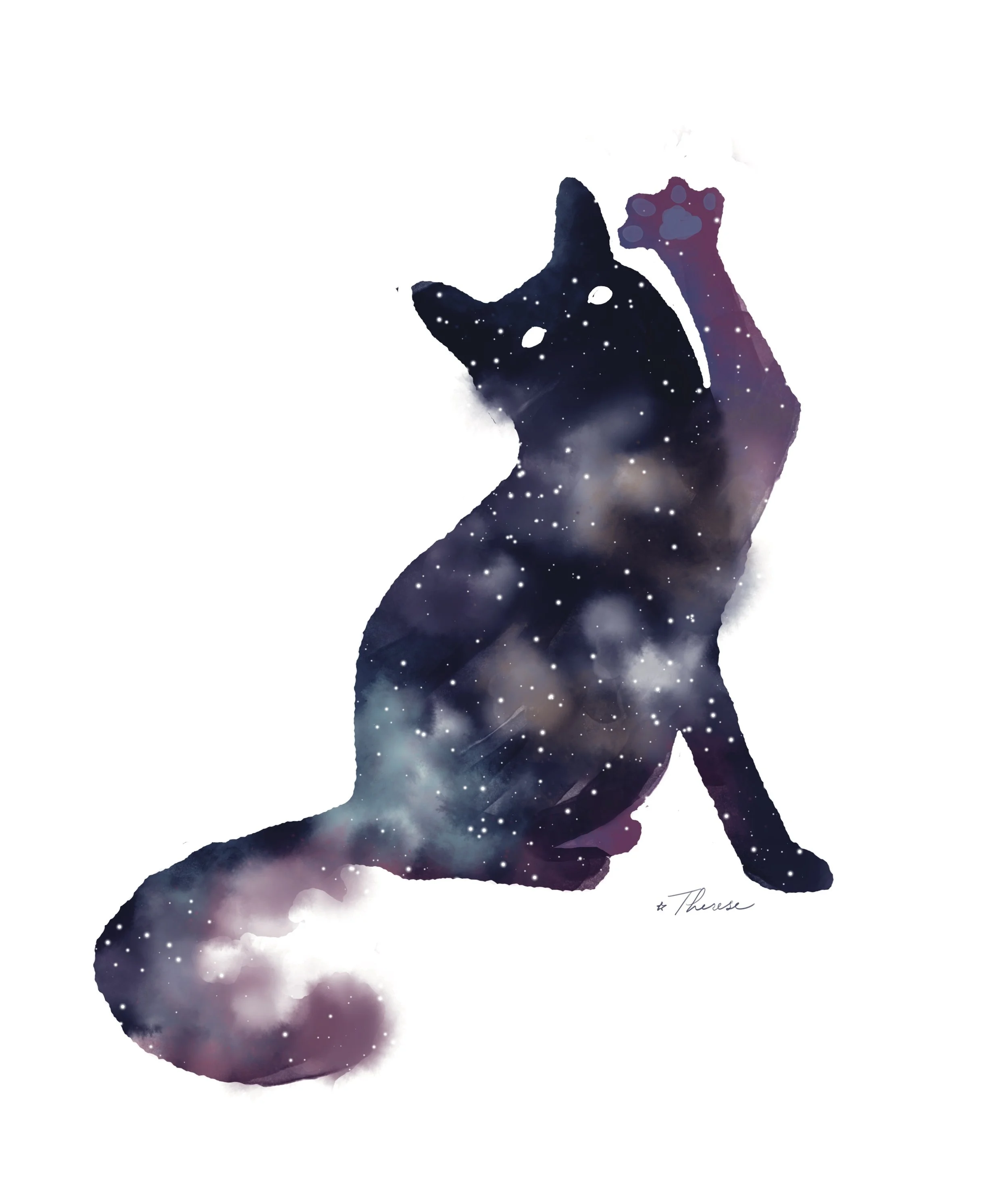 Each cat is painted as a silhouette filled with stars, nebulae, and moonlight—otherworldly beings lounging among the cosmos.